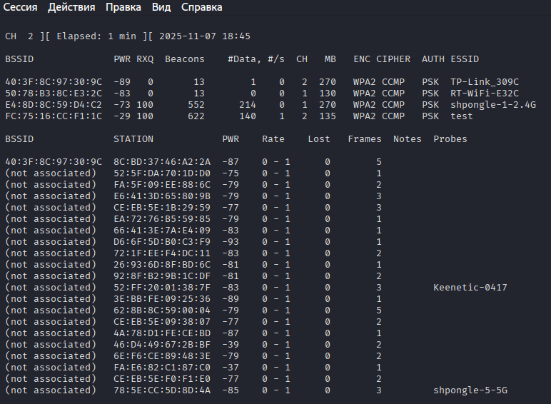 - на атакующем ноутбуке найдем все сети, которые есть рядом и подключенные к ним клиенты. В этом нам поможет команда airodump-ng;