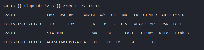 С помощью команды airodump-ng прослушаем весь эфир. Найдем BSSID нашей атакуемой сети “test”. К ней ДОЛЖЕН быть подключен хотя бы один клиент, потому что без этого не получим данные о подключении клиента к роутеру. Записываем BSSID роутера и STATION – это MAC клиента.