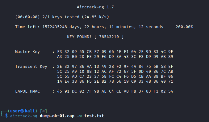 Далее берем текстовый файл с паролями. Это огромные файлы, в которых есть комбинации всех возможных паролей. Это называется “словарь”. И Теперь заставляем программу aircrack-ng перебрать данные из захваченных данных (dump-ok-01.cap) и подобрать пароль из словаря (test.txt). После запуска видим успех (словарь для стенда был очень короткий). Успех! Мы подобрали пароль.
